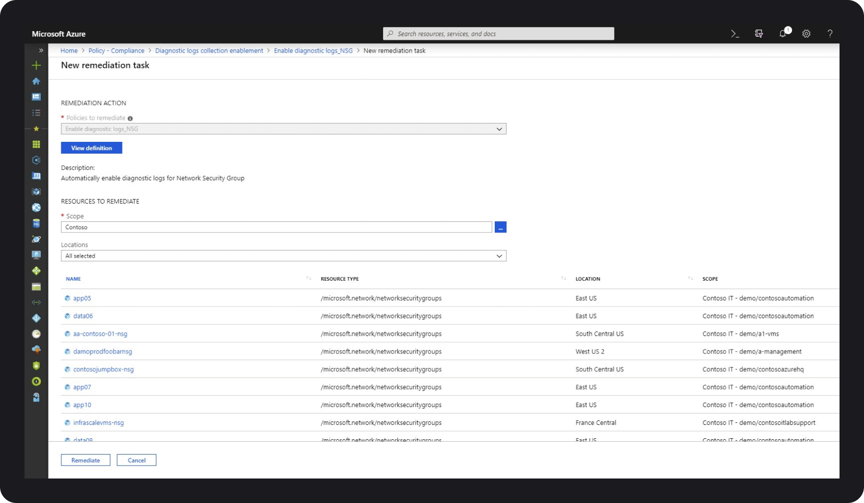 Bring your resources into compliance using bulk remediation instead of going through configuration errors one at a time. Ensure that drift is minimized by configuring automated remediation tasks through the Azure portal, PowerShell, or CLI. Write custom policy definitions to fit your specific needs.