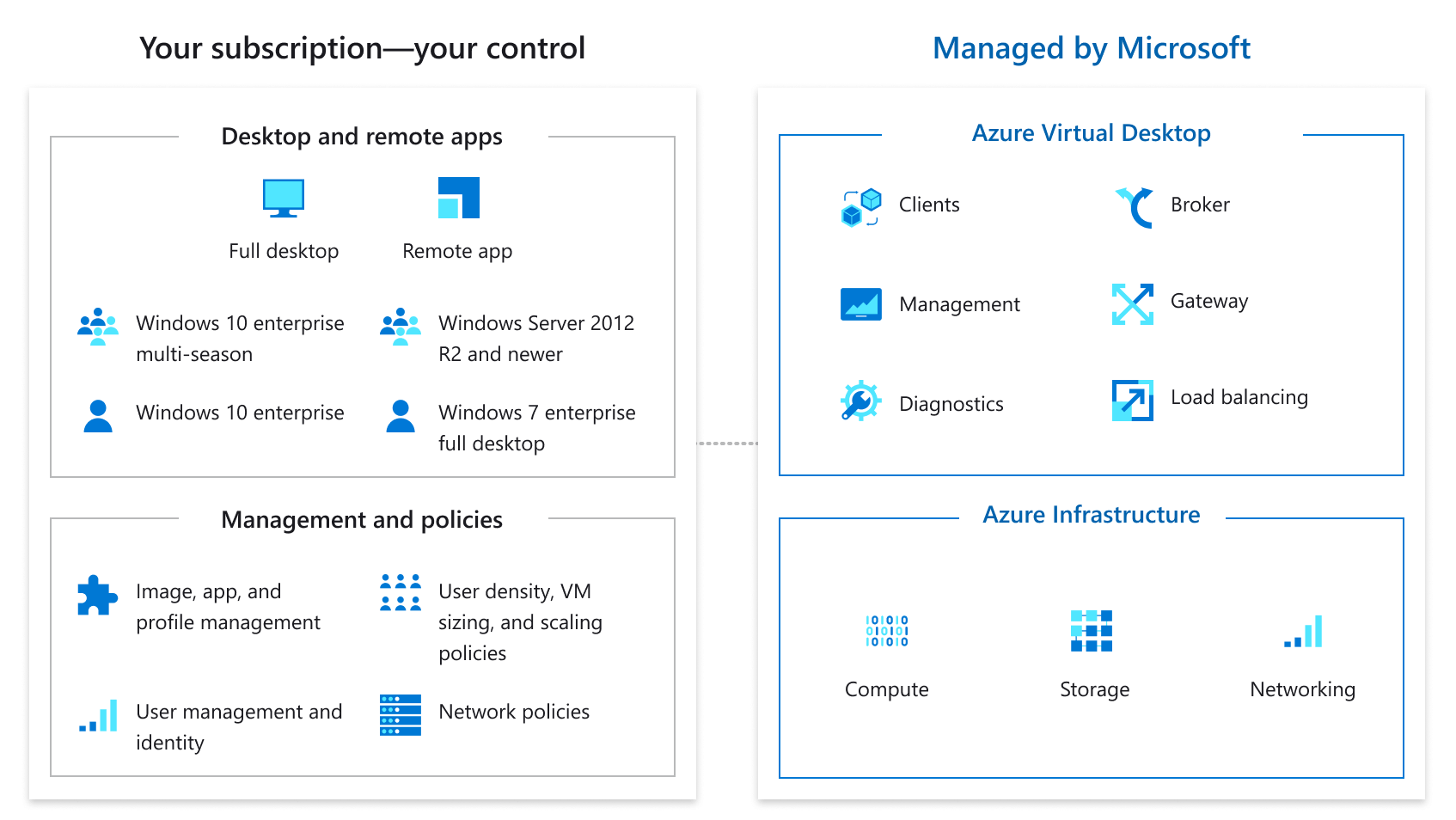 • The virtual desktop infrastructure, including broker, gateway, load balancer, and diagnostics, is managed by Azure Virtual Desktop.
