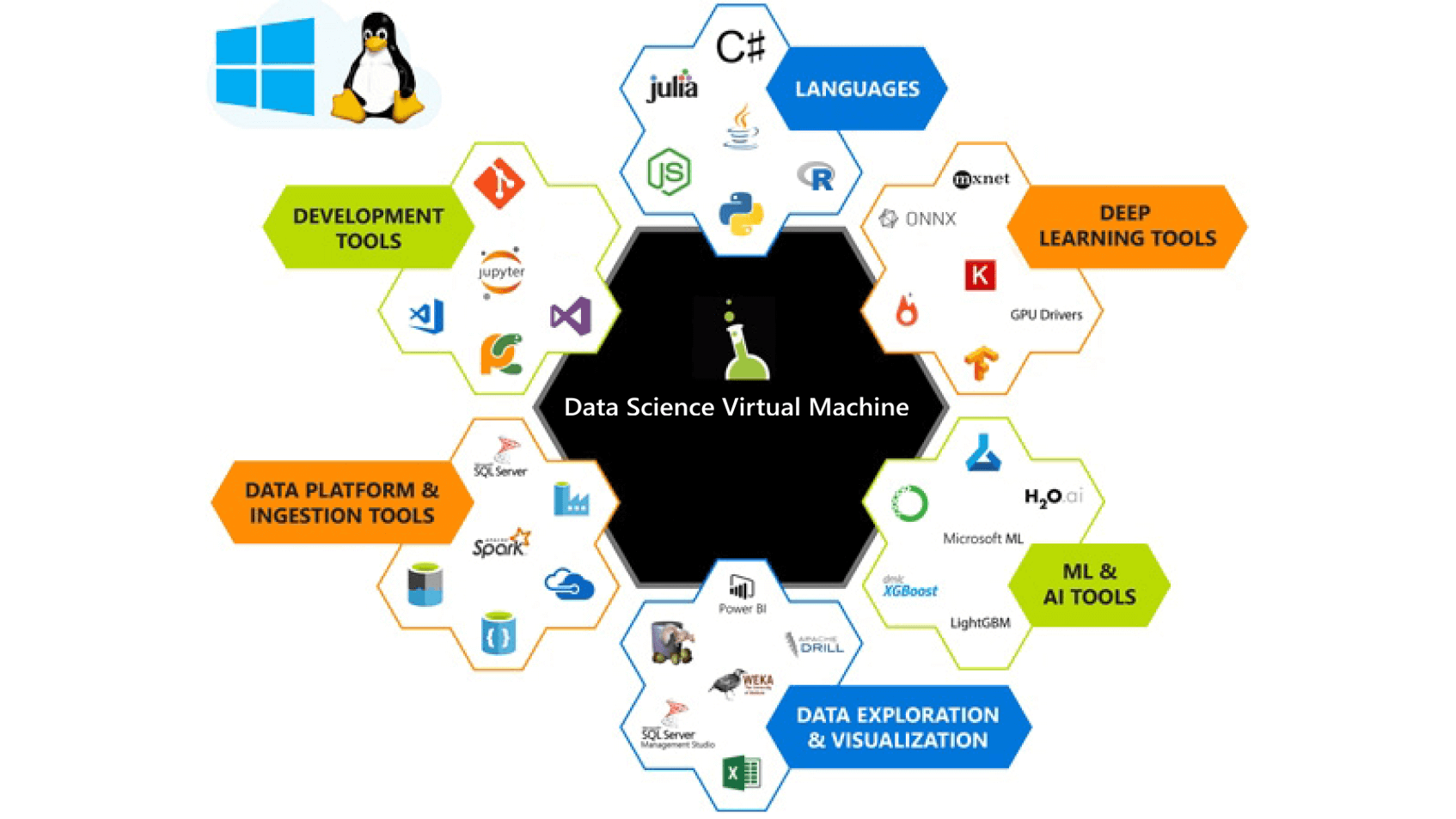 Examples, templates and sample notebooks built or tested by Microsoft are provided on the VMs to enable easy onboarding to the various tools and capabilities such as Neural Networks (PYTorch, Tensorflow, etc.), Data Wrangling, R, Python, Julia, and SQL Server.