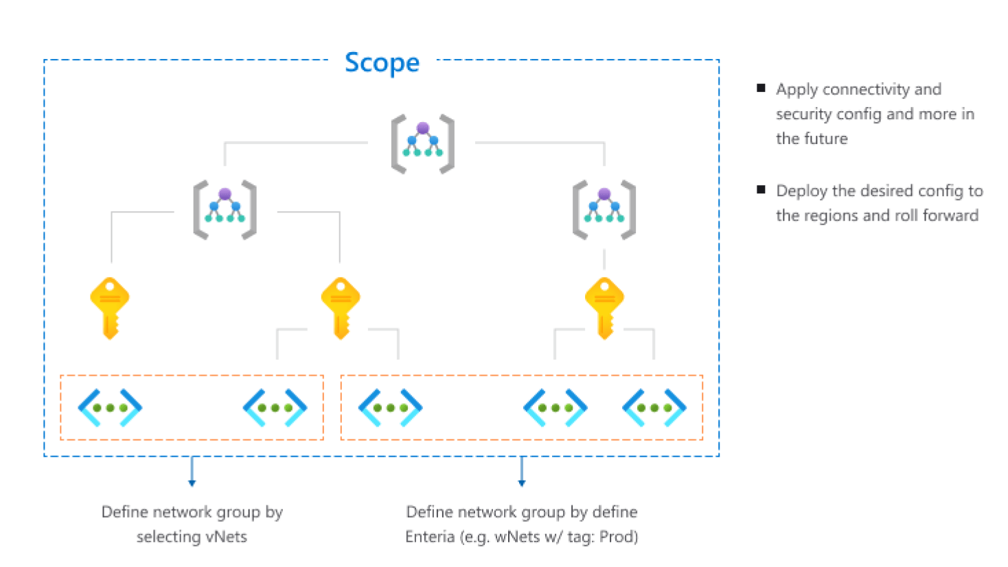 Apply security and connectivity configurations for all your virtual networks across regions and subscriptions. Manage the configurations for your entire environment from a single pane of glass.