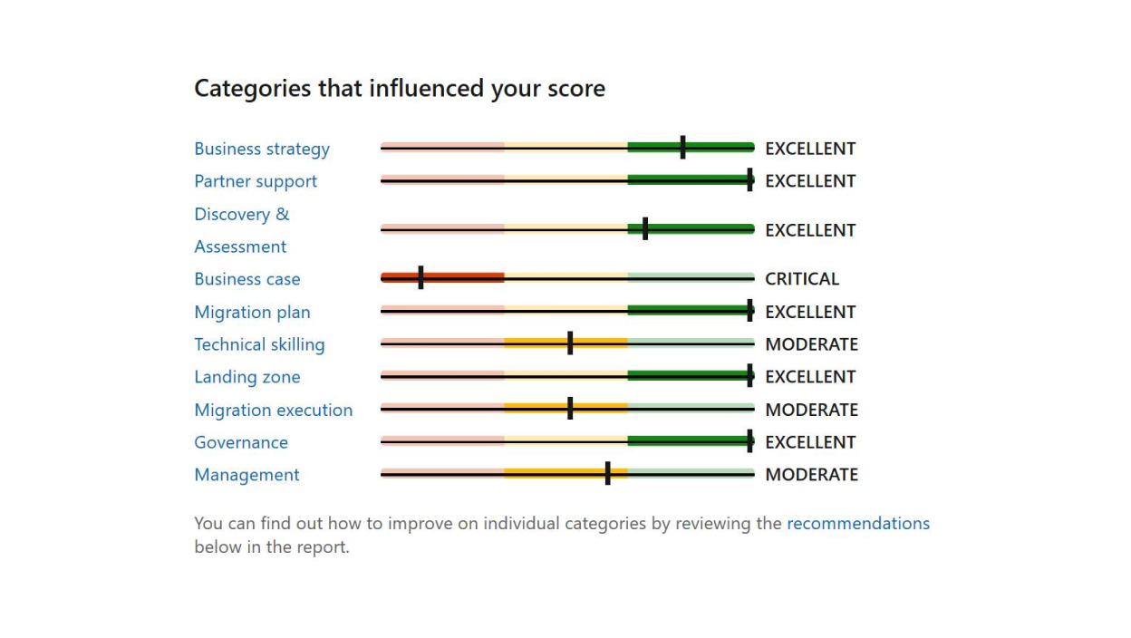 • Assessments let you quickly identify the best approach to cloud adoption for your organization. They provide recommendations based on your needs and let anyone in your organization review them at their convenience. In addition to pinpointing your cloud adoption needs, these assessments help you define your governance benchmark and evaluate your workloads.