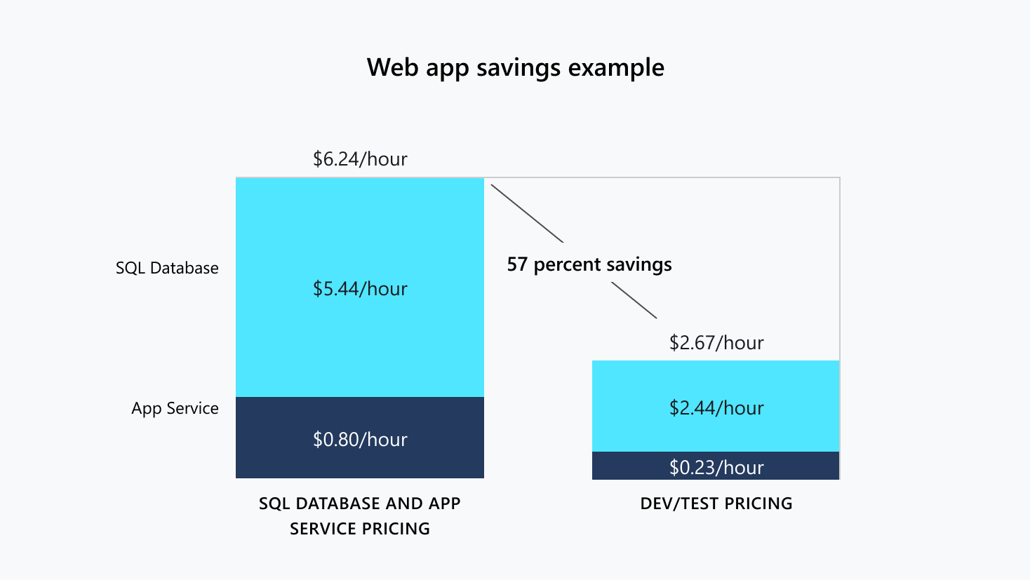 - 对于运行 SQL 数据库和应用服务的典型 Web 应用开发/测试环境,可节省高达 57% 的成本。