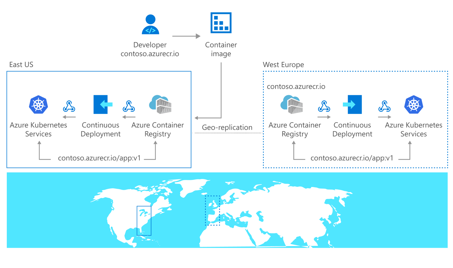 无论用户和主机身在何处,通过多主数据库异地复制启用单个注册表,都可为用户和主机提供服务。通过将项目推送到任何一个副本,可在所有副本之间同步该项目。本地拉取变为可用时,通过使用区域化的 Webhook 接收通知来加快部署。