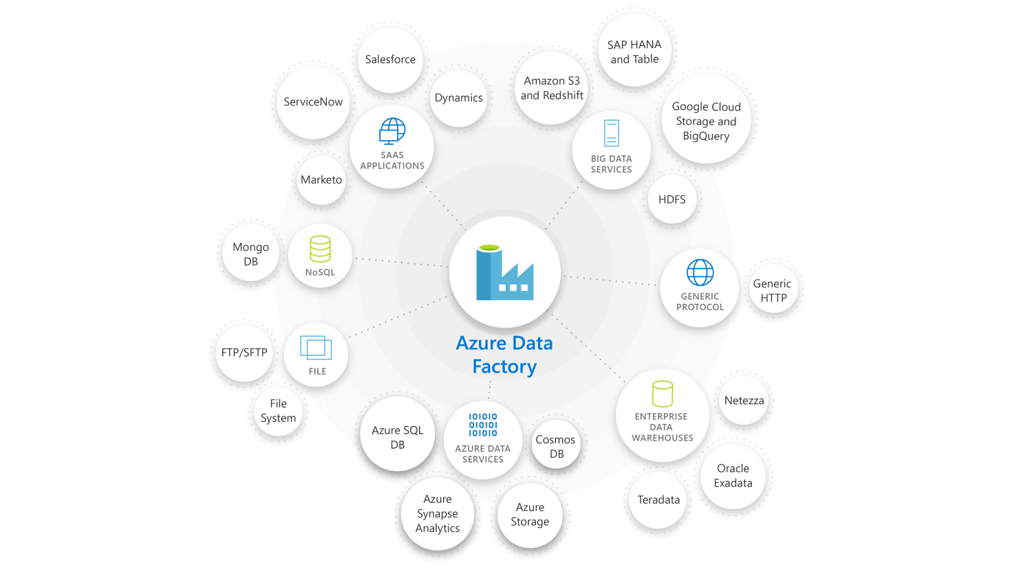 - 从 90 多种内置连接器中进行选择,以从以下位置获取数据: Amazon Redshift、Google BigQuery、HDFS 等大数据源; 企业数据仓库,如 Oracle Exadata、Teradata; SaaS 应用程序,如 Salesforce、Marketo 和 ServiceNow; 以及所有 Azure 数据服务。
