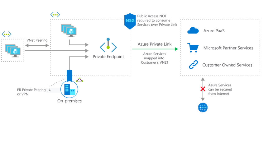 从本地或对等虚拟网络,通过专用对等互连或 VPN 隧道访问专用终结点。Microsoft 托管流量,因此你不需要设置公共对等,也不需要使用 Internet 将工作负荷迁移到云。