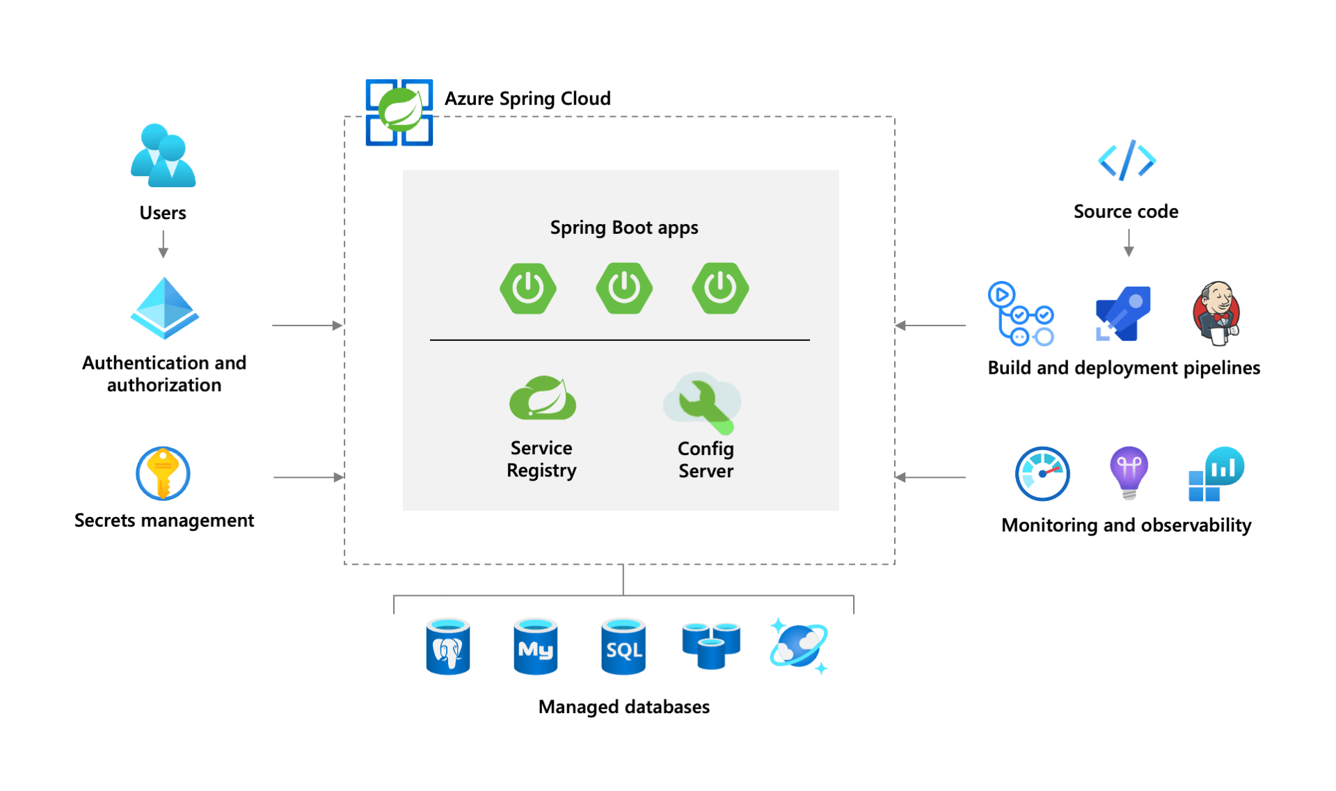 快速添加服务和功能,包括托管的 MySQL、PostgreSQL 和 SQL 数据库、性能监视以及机密管理。通过 Java 消息服务 (JMS) 支持和 Azure API 管理将应用程序与集成服务(如 Azure 服务总线)连接起来。