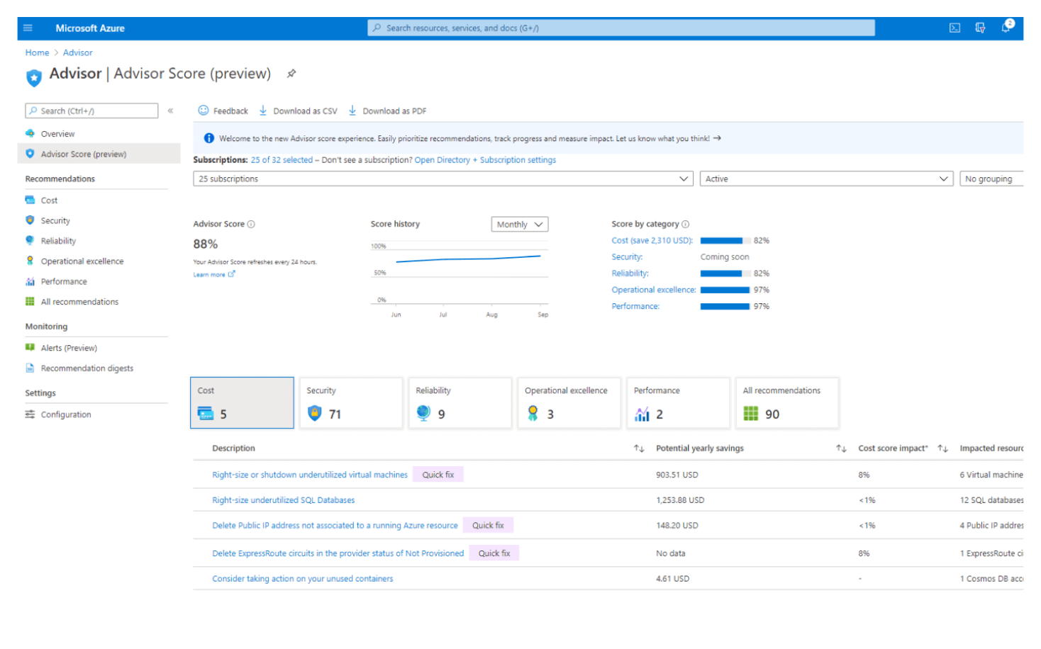 部署后,使用基于架构良好的框架的 Azure 顾问监视工作负荷的所有方面。通过个性化建议和行业最佳做法来评估 Azure 中部署的资源。