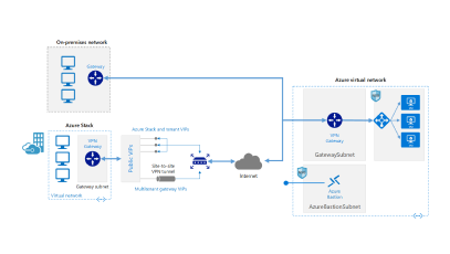 使用站点到站点的虚拟专用网 (VPN),将网络从本地或 Azure Stack 扩展到 Azure 虚拟网络。流量通过 IPsec VPN 隧道或通过 Azure Stack 多租户 VPN 网关在本地网络与 Azure 之间流动。