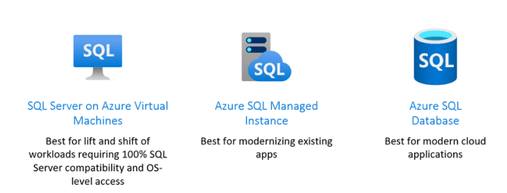 针对需求选择合适的 Azure SQL 服务时有三个主要考虑因素。如果由于符合性或软件依赖性而需要控制基础 OS,并且希望继续使用当前版本的 SQL Server,则重新托管到 Azure 虚拟机上的 SQL Server 将是最佳选择。但是,如果不需要 OS 控制,并且想要使用最新的“无版本”SQL Server,那么在完全托管的解决方案(如 Azure SQL 数据库或 Azure SQL 托管实例)上更新现有应用程序或支持新式云应用程序将是最佳选择。
